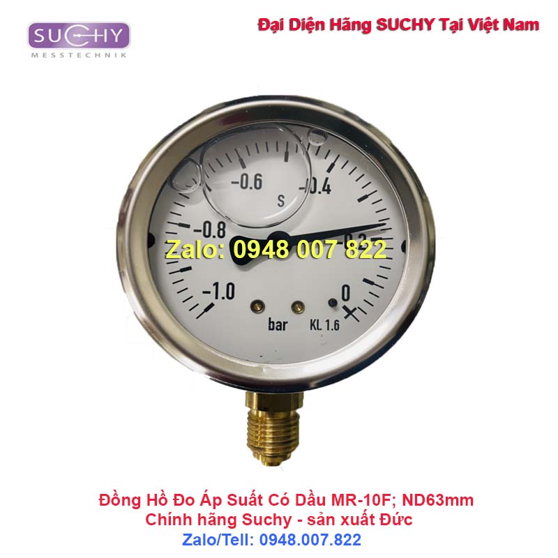Đồng hồ đo áp suất -1…0bar Suchy MR-10F là  Đồng hồ đo áp suất ống Bourdon đo áp suất đến -1bar …0bar, chứa glycerin (dầu chống rung), kết nối đáy. Đường kính mặt đồng hồ 63mm, cấp chính xác 1.6 theo tiêu chuẩn EN 837-1